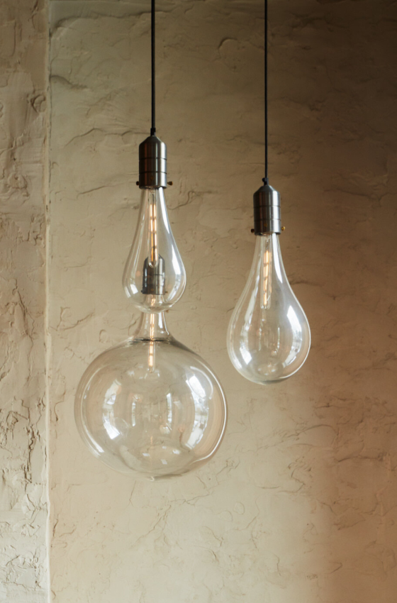 A simple but meticulously machined metal socket and blown glass globe come together to create a pendant that playfully references the wabi sabi undoneness of a bare vintage light bulb.